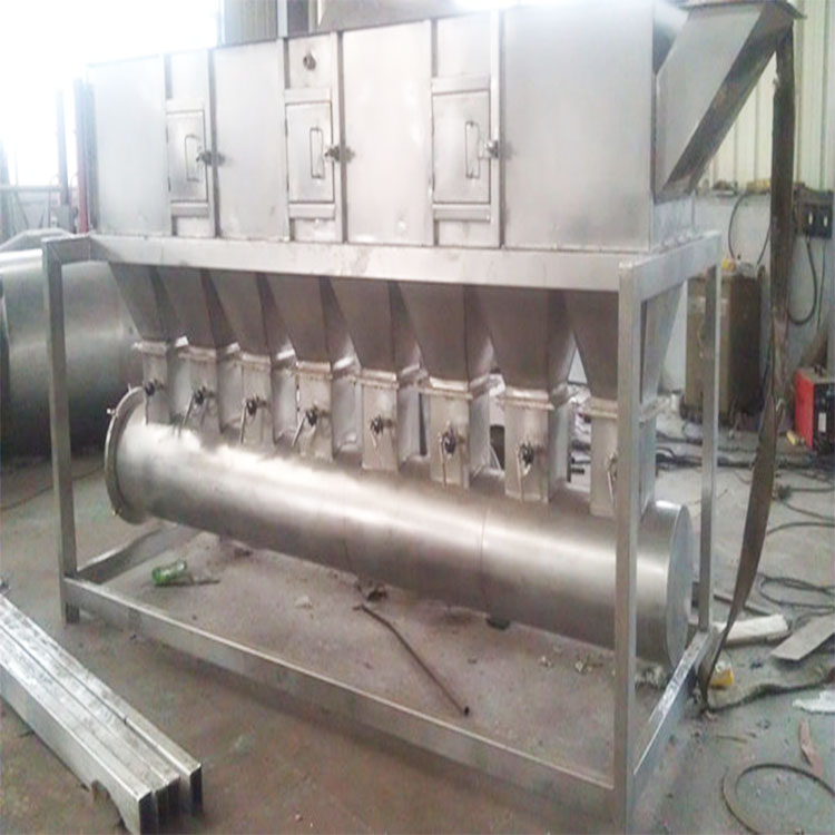 沸騰干燥,又稱流化床,它是由空氣過濾器、加熱器、沸騰床主機、旋風分離器、布袋除塵器、高壓離心風機、操作臺組成,由于干燥物料的性質不同,配套除塵設備時,可按需要考慮,可同時選擇旋風分離器、布袋除塵器,也可選擇其中一種,一般來說比重大的如沖劑及顆粒物料干燥只需選擇旋風分離器,比重輕的小顆粒狀和粉狀物料需配套布袋除塵器,并備有氣力送料裝置及皮帶輸送機供選擇。