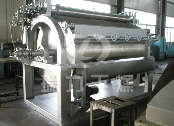 滾筒干燥機(jī)是一種內(nèi)加熱傳導(dǎo)型轉(zhuǎn)動(dòng)連續(xù)干燥設(shè)備。旋轉(zhuǎn)的滾筒通過(guò)其下部料槽,粘附著一厚度的料膜,熱量通過(guò)管道輸送至滾筒內(nèi)壁,傳導(dǎo)到滾筒外壁,再傳導(dǎo)給料膜,使料膜中的濕得到蒸發(fā)、脫濕、使含濕分的物料得到干燥。干燥好的物料被裝置在滾筒表面的刮刀鏟離滾筒,到置于刮刀下方的螺旋輸送器,通過(guò)螺旋輸送器將干物料集中、包裝。