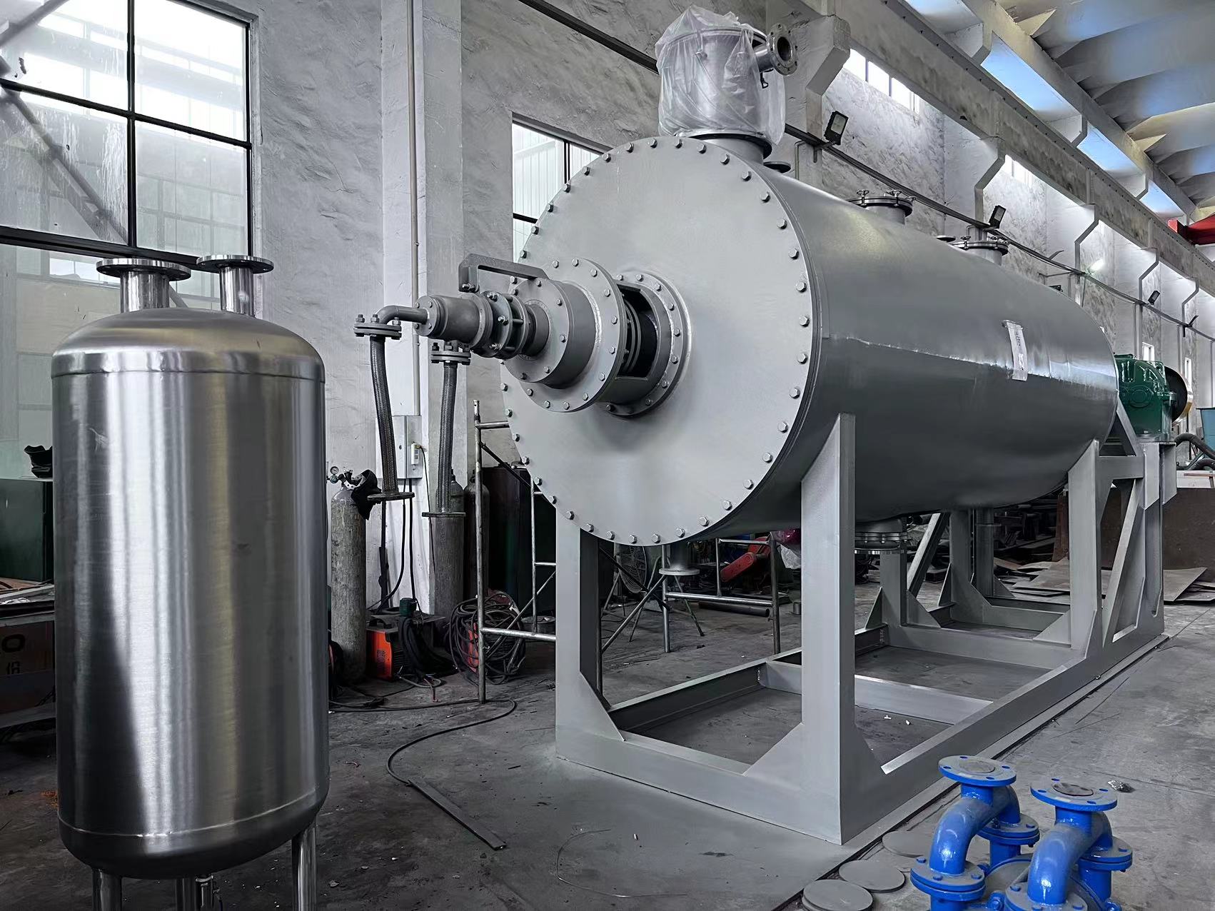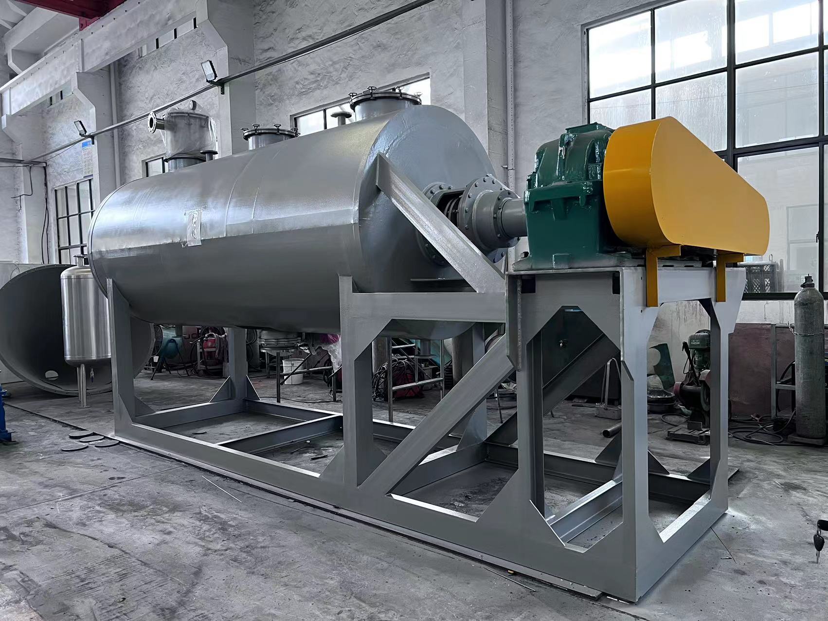 真空耙式干燥機(jī)機(jī)身中間為圓柱形,器身內(nèi)外分為三層,中間夾套加熱介質(zhì)可以是導(dǎo)熱油循環(huán)(壓力<0.3mpa表壓)或蒸汽(壓力<0.3mpa表壓),外層用超細(xì)玻璃棉,保溫效果很好,耗能很少,內(nèi)層投放物料,適用于有被氧化危險(xiǎn)的物料和熱敏性物料的干燥,在干燥過程中不破壞晶體狀的物料,限制金屬離子的物料以及要求排出揮發(fā)物(或有*物質(zhì))須回收(或有*性)的物料,則更能顯示了它的優(yōu)越性。