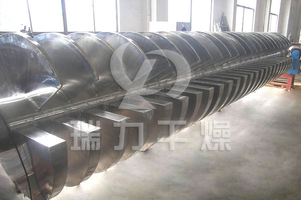 二、 設(shè)備原理:高嶺土專用槳葉干燥機(jī)的空心軸上密集排列著楔型中空漿葉,熱介質(zhì)經(jīng)空心軸流經(jīng)漿葉。單位有效容積內(nèi)傳熱面積很大,熱介質(zhì)溫度從-40℃到320℃,可以是水蒸汽,也可以是液體型:如熱水、導(dǎo)熱油等。間接傳導(dǎo)加熱,沒(méi)有攜帶空氣帶走熱量,熱量均用來(lái)加熱物料。熱量損失僅為通過(guò)器體保溫層向環(huán)境的散熱。楔型漿葉傳熱面具有自清潔功能。物料顆粒與楔型面的相對(duì)運(yùn)動(dòng)產(chǎn)生洗刷作用,能夠洗刷掉楔型面上附著物料,使運(yùn)轉(zhuǎn)中一直保持著清潔的傳熱面。漿葉干燥機(jī)的殼體為Ω型,殼體內(nèi)一般安排二到四根空心攪拌軸。殼體有密封端蓋與上蓋,防止物料粉塵外泄而充分發(fā)揮作用。