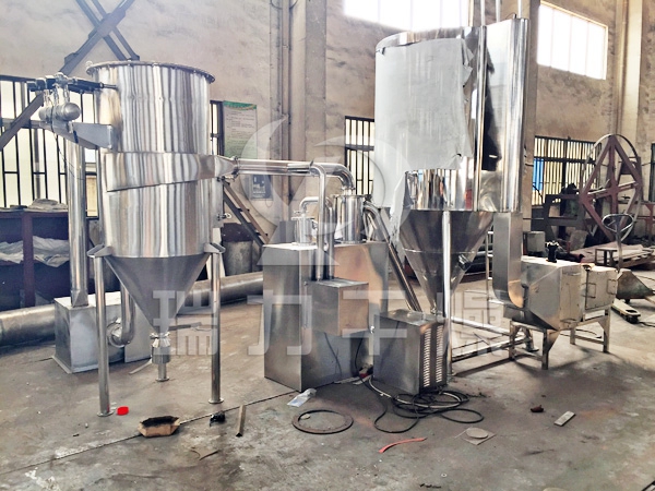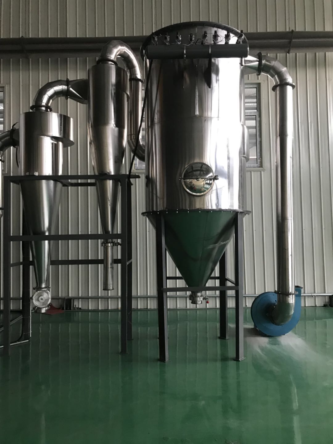 血漿血球蛋白粉是由供料系統(tǒng)、介質(zhì)循環(huán)系統(tǒng)、空氣加熱凈化系統(tǒng)、干燥塔系統(tǒng)、收料系統(tǒng)、控制系統(tǒng)等多個系統(tǒng)整合而成。主塔系統(tǒng)集中了目前噴霧干燥工程的所有尖端技術,噴干機組的收料系統(tǒng)由一級旋風分離器+布袋除塵器組合形成。一級旋風采用高氣量高效率旋風進行收集,其收粉率能達到96%左右分,而布袋除塵器是針對蛋白粉類除塵專門設計的優(yōu)化設備,能使物料與風進行完全分離并沉降,布袋為拒水防油防靜電布袋,過濾目數(shù)可達500目以上。