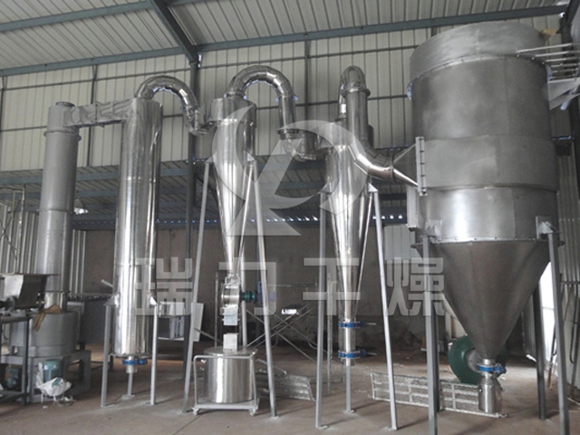 熱空氣切線進入干燥器底部,在攪拌器帶動下形成強有力的旋轉風場。膏狀物料由螺旋加料器進入干燥器內,在高速旋轉攪拌槳的強烈作用下,物料受撞擊、磨擦及剪切力的作用下得到分散,塊狀物料迅速粉碎,與熱空氣充分接觸、受熱、干燥。脫水后的干物料隨熱氣流上升,分級環(huán)將大顆粒截留,小顆粒從環(huán)中心排出干燥器外,由旋風分離器和除塵器回收,未干透或大塊物料受離心力作用甩向器壁,重新落到底部被粉碎干燥。