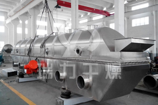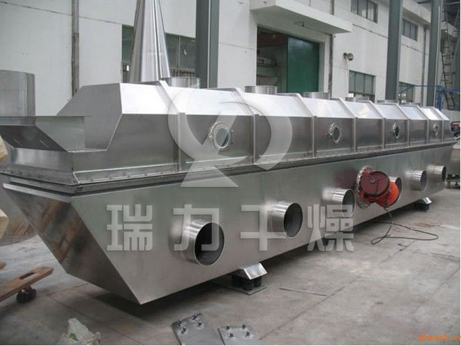 磷酸二氫鉀專用流化床干燥機(jī)的物料自進(jìn)料進(jìn)口進(jìn)入機(jī)內(nèi),在振動(dòng)力作用下,物料沿水平面流化床拋擲,向前連續(xù)運(yùn)動(dòng),熱風(fēng)向上穿過流化床同濕物料換熱后,濕空氣經(jīng)旋風(fēng)分離器除塵后由排風(fēng)1:3排出.干燥物料由排料進(jìn)口排出。